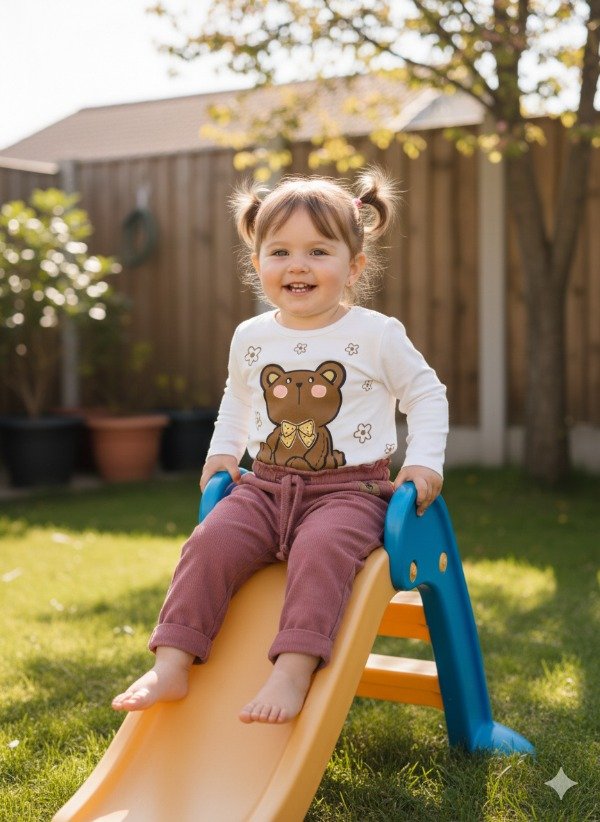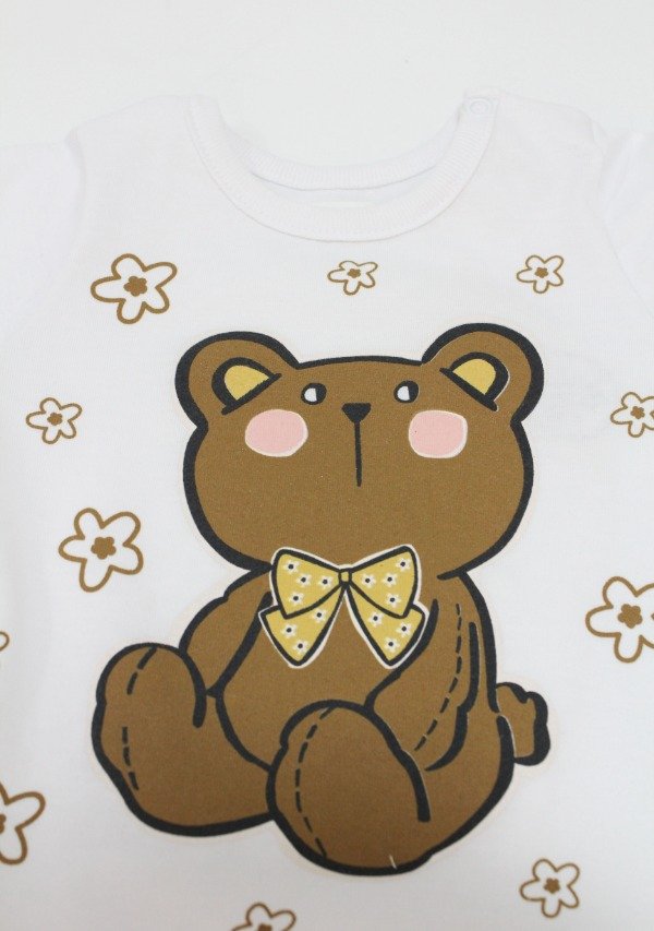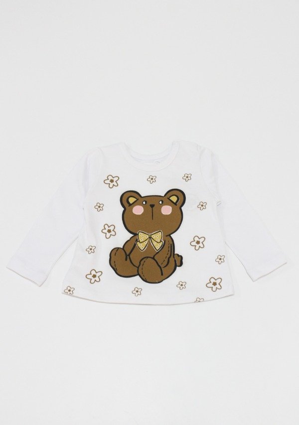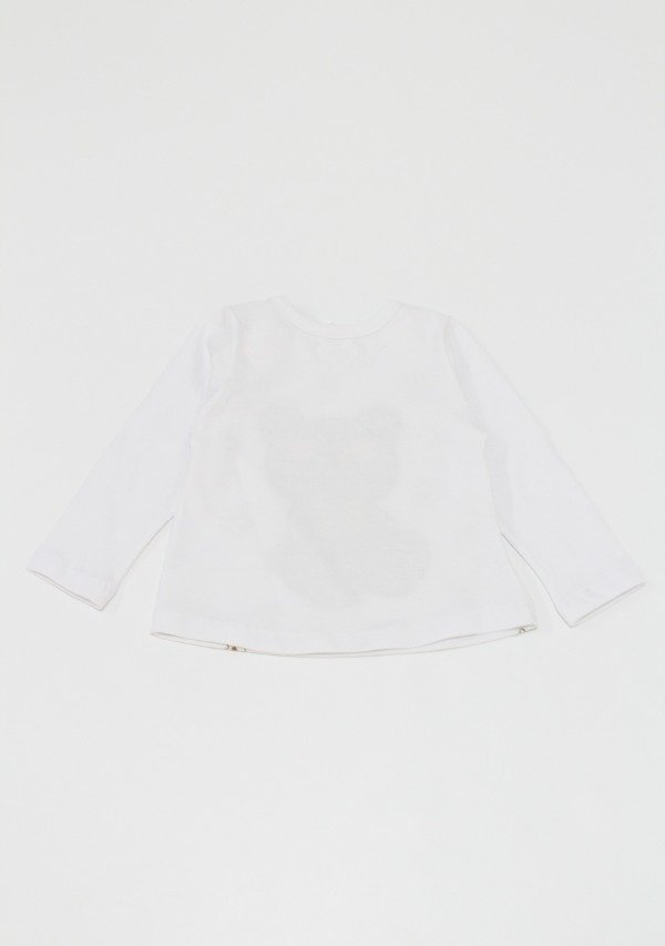 Remera manga larga de algodón blanco con cuello redondo. Tiene estampa en el frente y broches en los hombros para facilitar su acceso.