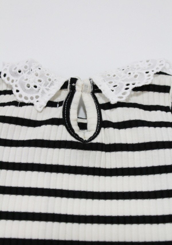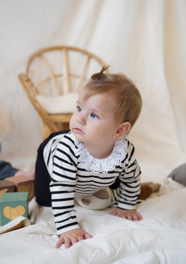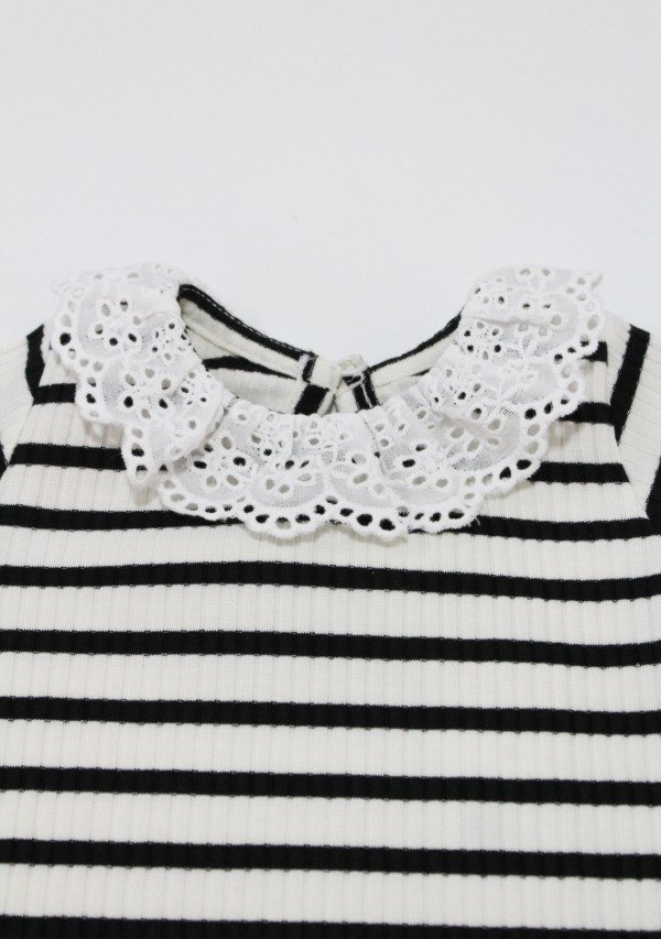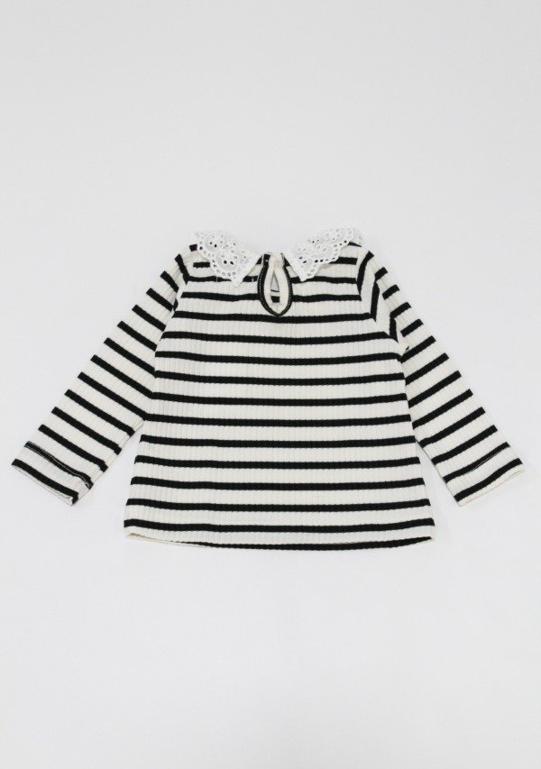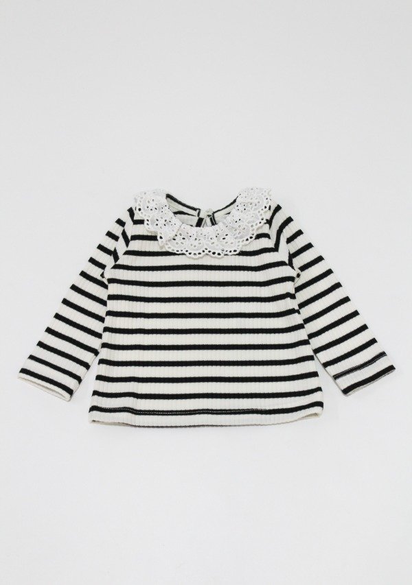 Remera manga larga de morley rayado negro/off white con volado en broderie todo alrededor del cuello. Tiene botón en la espalda para facilitar su acceso.
