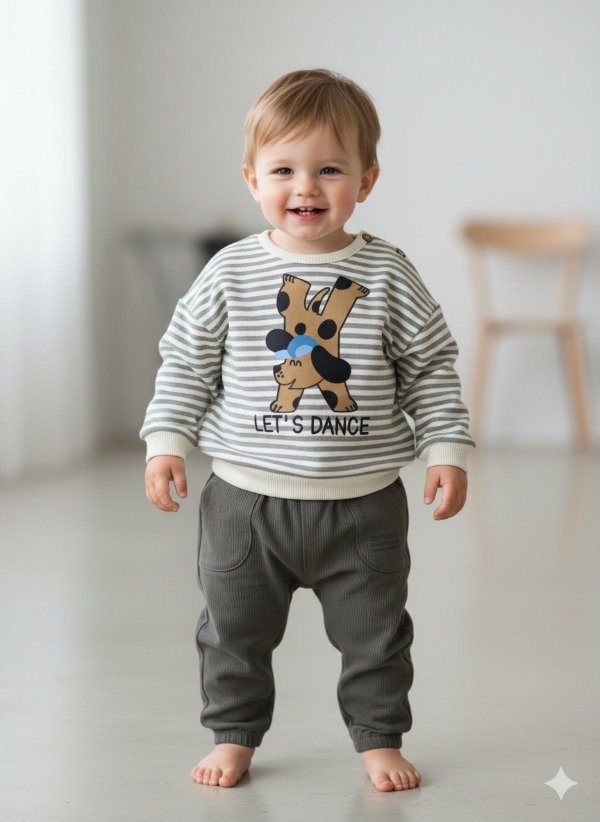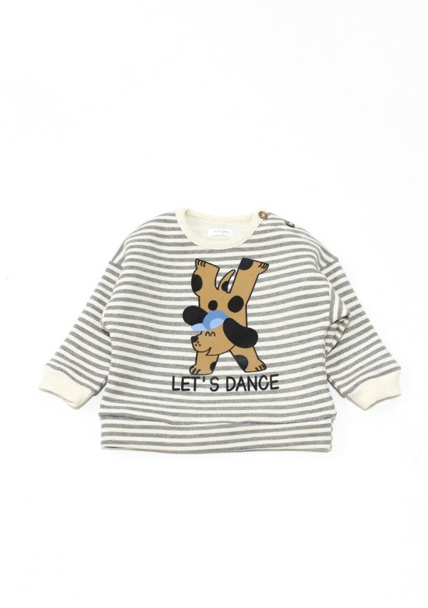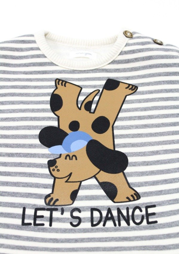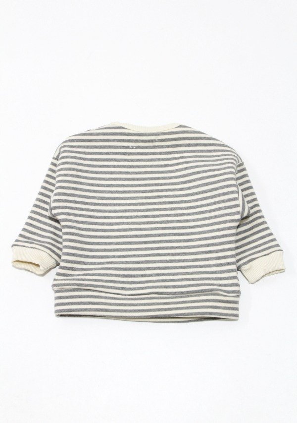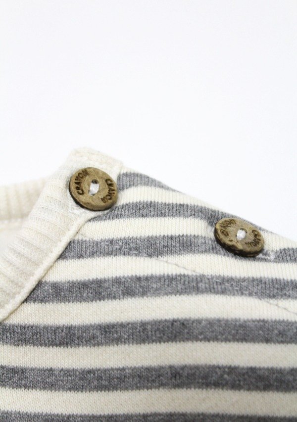 Buzo de frisa rayada gris/off white con puños y cuello en morley. Tiene estampa en el frente. Botones en el hombro para su apertura.
