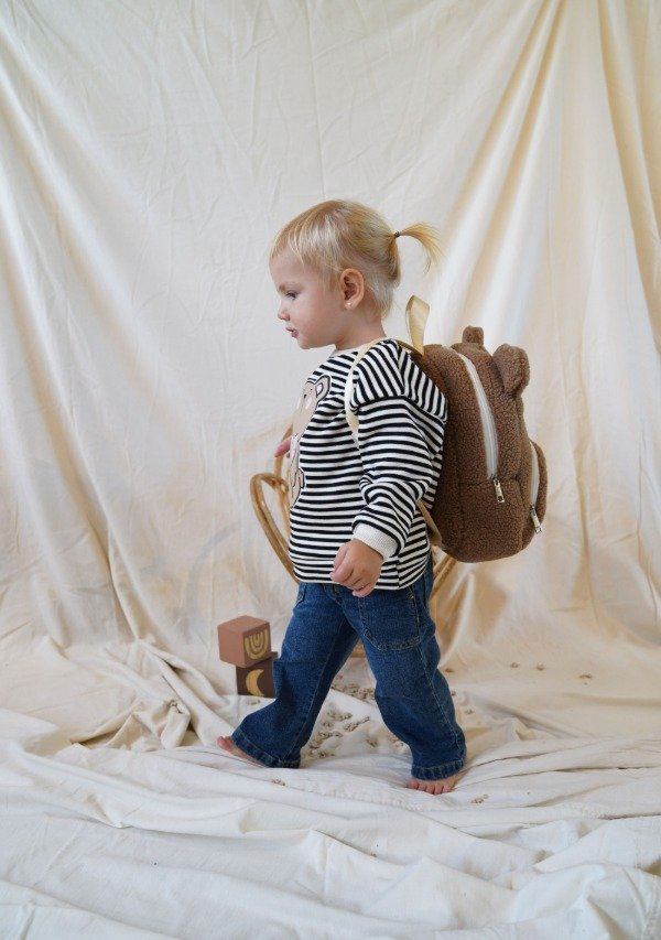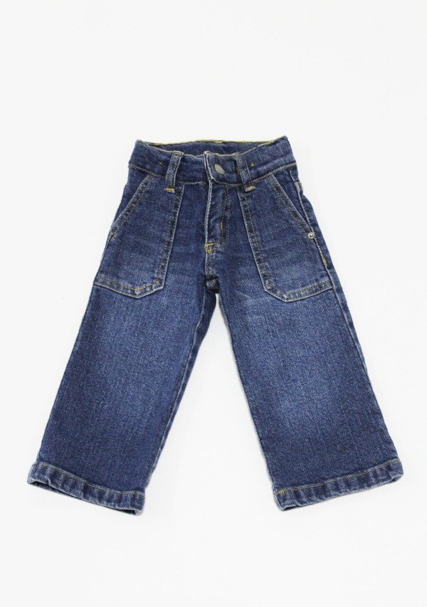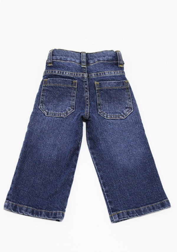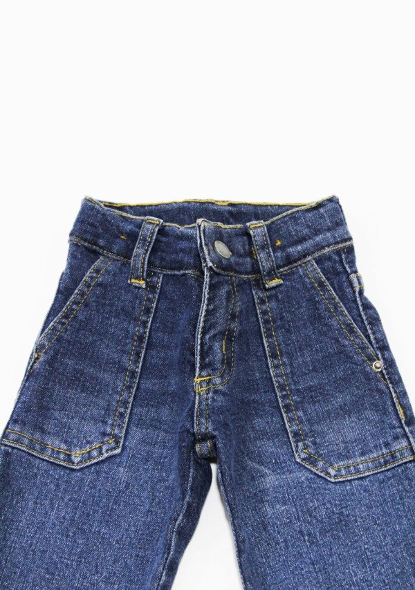 Jean recto azul oscuro con bolsillos aplicados. Tiene cintura regulable en su interior. Cierre y botón metálico.