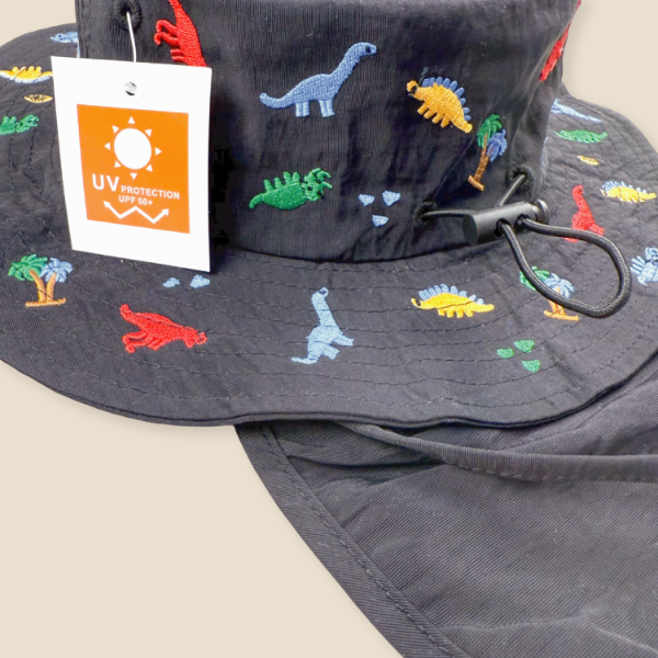 Está confeccionado en tela liviana, respirable e impermeable, con protección solar UV50, visera ancha y una solapa trasera que cubre la nuca, perfecta para días de playa, campo o paseo.