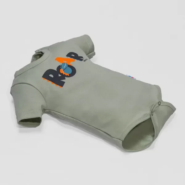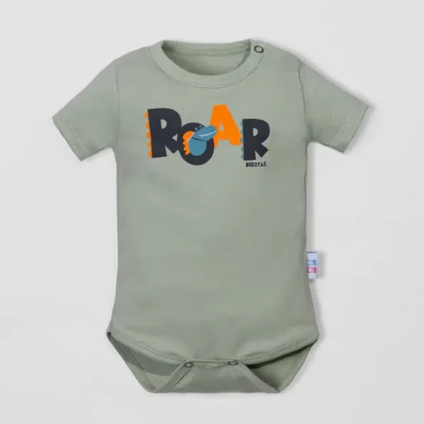 Body manga corta, 100% algodón con elastano, en base verde menta, con estampa central "ROAR" y un simpatico dino. La tela es muy muy suavecita al tacto, bien liviana y elastizada. Es super cómodo y clásico para cualquier ocasión. Tiene un broche en el cuellito para una fácil postura y dos más en la parte inferior.