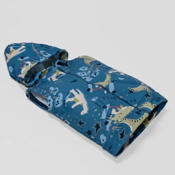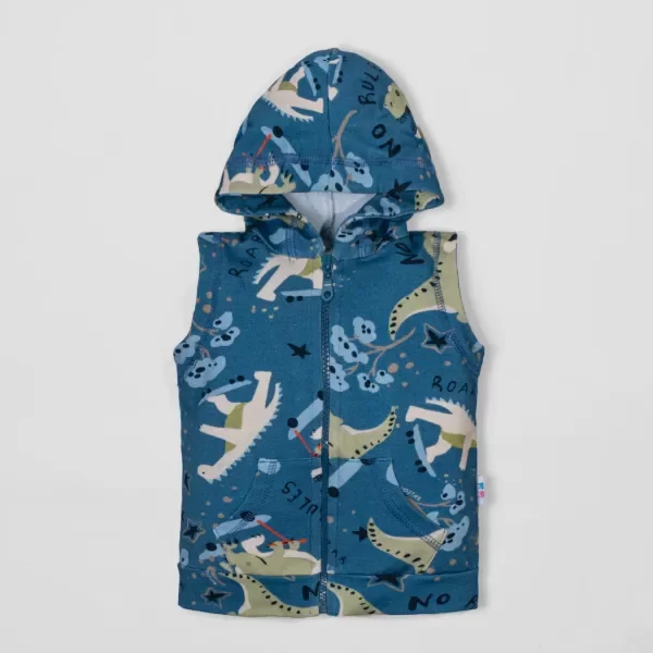 Chaleco de tela rústica elastizada, en base azul, completamente estampado con dinos en patineta en tonos verde, celeste y beige. Modelo hiper clásico. Súper cómodo y liviano. Tiene cierre al tono, capuchita y bolsillos que lo hacen super cool. Muy canchero y cómodo para usar todo el día y en toda ocasión.