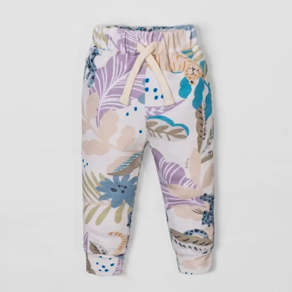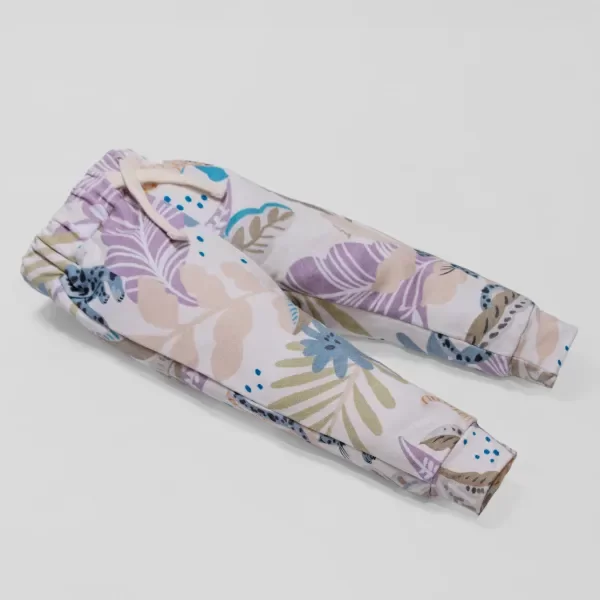Pantalón tipo Jogger en algodon rustico elastizado premium, en base natural, completamente estampado con flores, plantas y leoparditas en tonos lila, celeste y beige. Súper cómodo y canchero. Con bolsillos , elástico en la cintura con un cordoncito al tono.