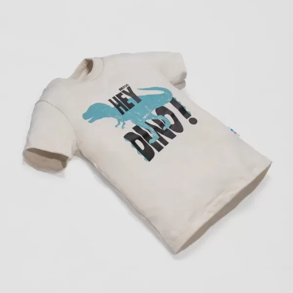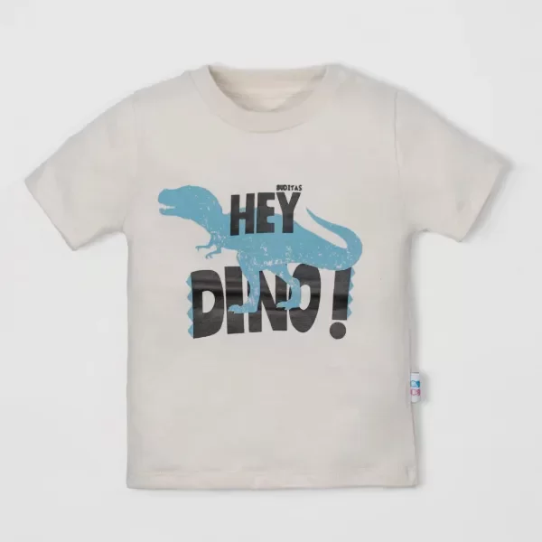 Remera manga corta de algodón color beige bien clarito. Tiene una divertida estampa central con la insicrpcion "Hey Dino!" y un dinosaurio en celeste. Es muy liviana y recontra canchera. Es una prenda super versatil, para usar todo el día y en cualquier ocasión, además de muy combinable.