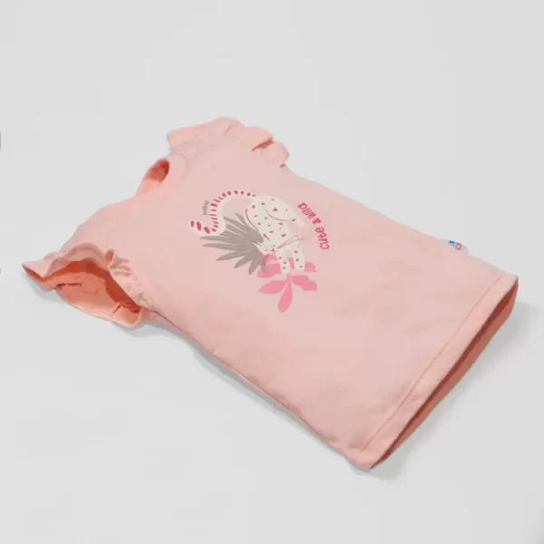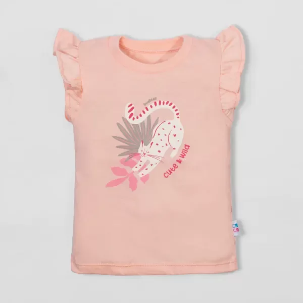 Remera manga corta de algodón color rosa. Tiene una divertida estampa central con una tierna leopardita. Tiene voladitos en hombro, que la hace super delicada. Es muy liviana y recontra canchera.