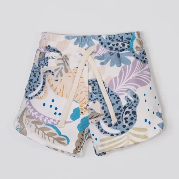 Short de tela rústica elastizada premium, en base natural, completamente estampado con flores, plantas y leoparditas en tonos lila, celeste y beige. Súper cómodo y liviano. Con elástico en la cintura, cordoncito al tono y bolsillos que lo hacen super cool. Muy canchero y cómodo para usar todo el día y en toda ocasión.