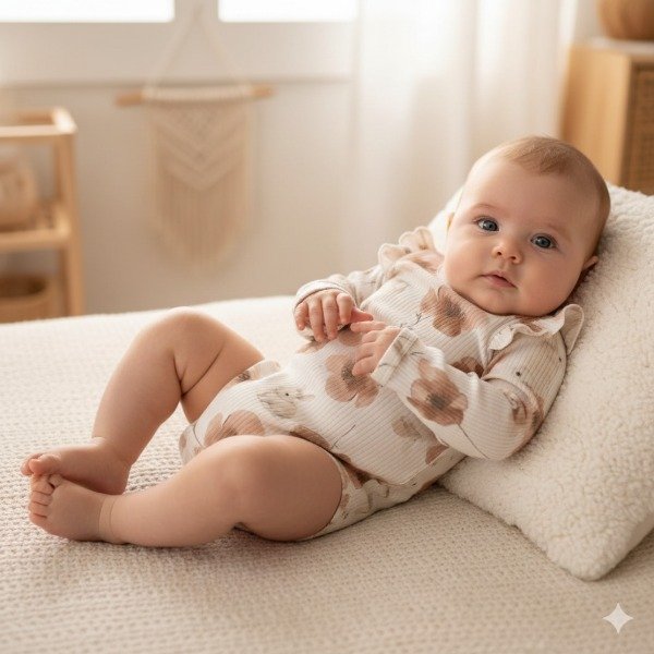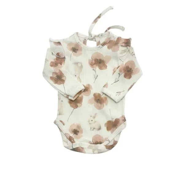 Body confeccionado en morley suave y elastizado, ideal para acompañar la piel delicada del bebé. Su diseño de manga larga con volados en los hombros aporta un detalle delicado y encantador. Perfecto para looks cómodos pero especiales. El estampado sutil le da un toque tierno y atemporal, fácil de combinar. Cuenta con broches en la entrepierna para facilitar el cambio de pañal y brindar mayor practicidad en el día a día.