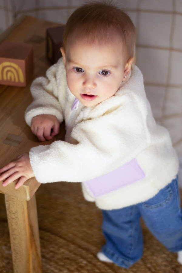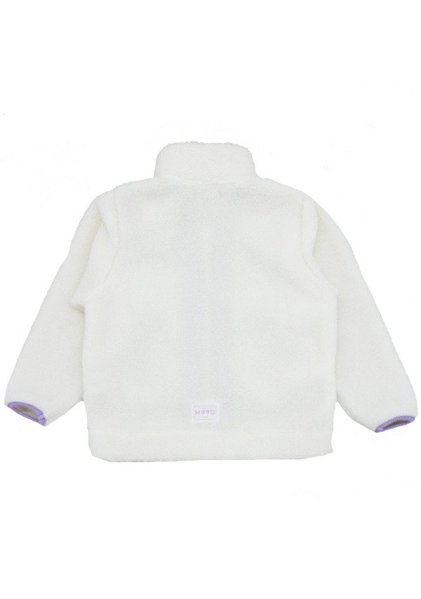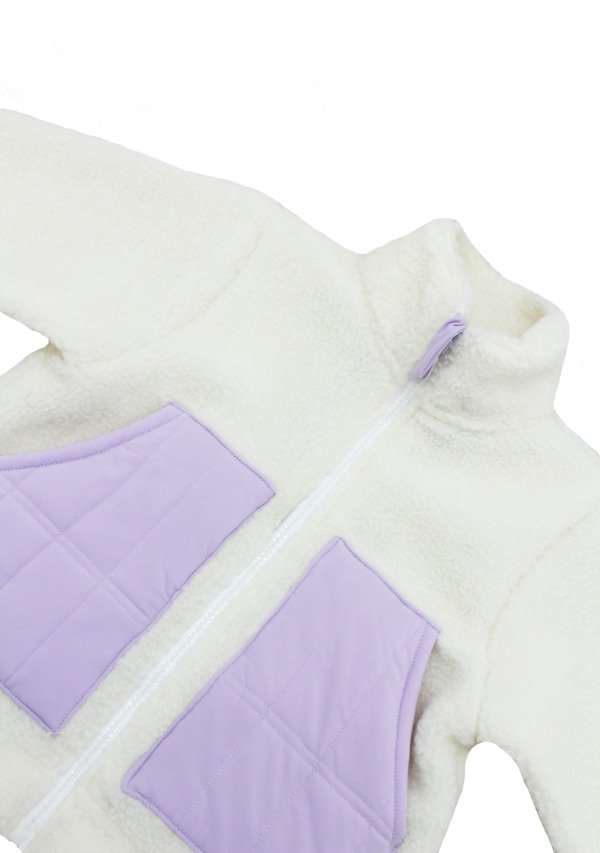 Campera de corderito off white con cierre. Detalle de bolsillos en tela plana.