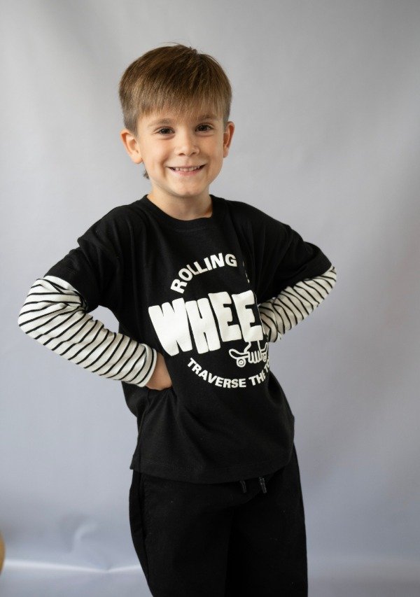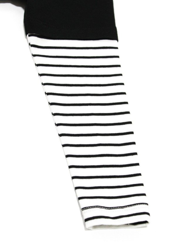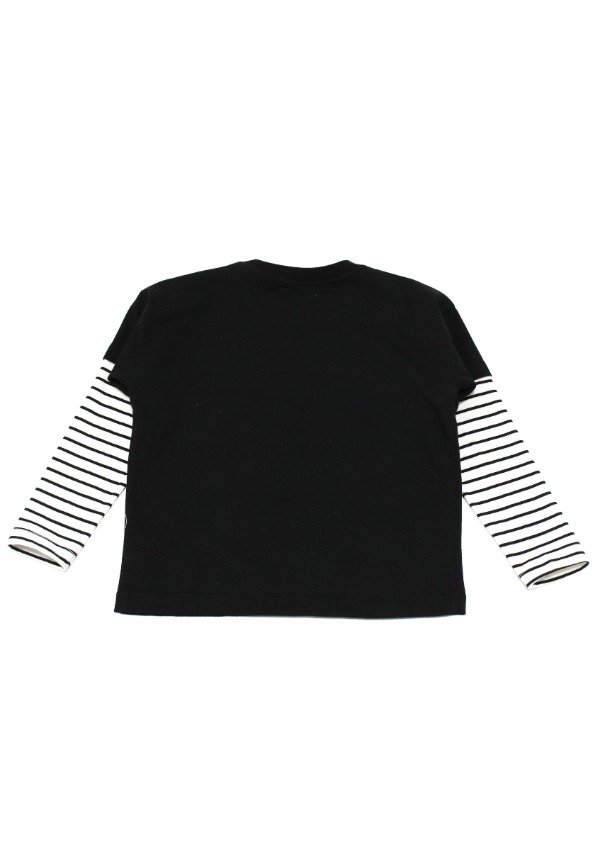 Remera en algodón negro con mangas rayadas blanco/negro. Estampa en el frente.