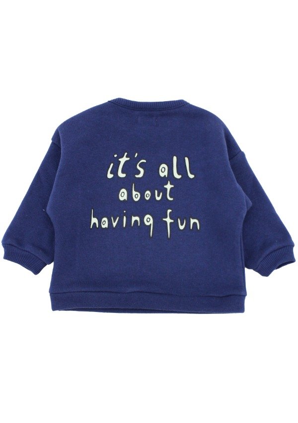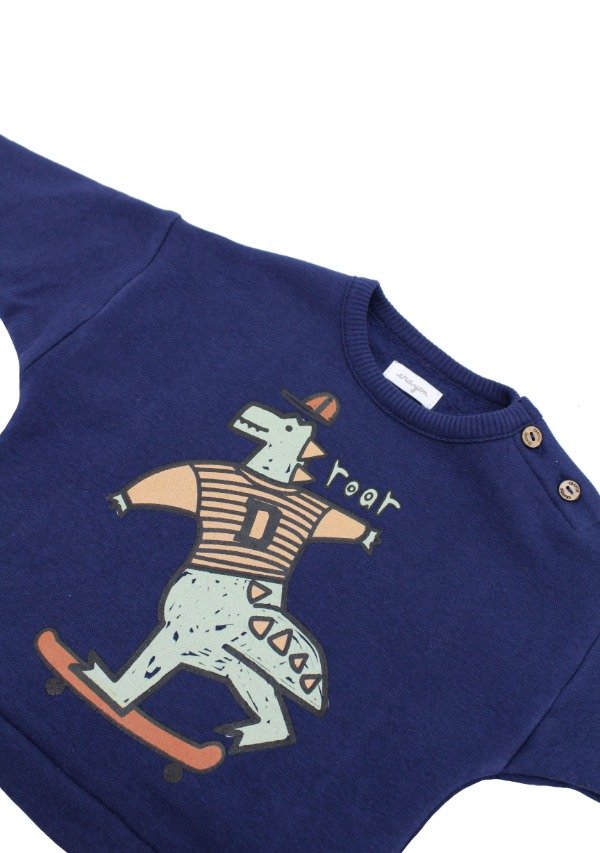 Buzo de frisa con cuello y puños en morley al tono. Tiene cartera con botones de madera. Estampa en el frente y la espalda.