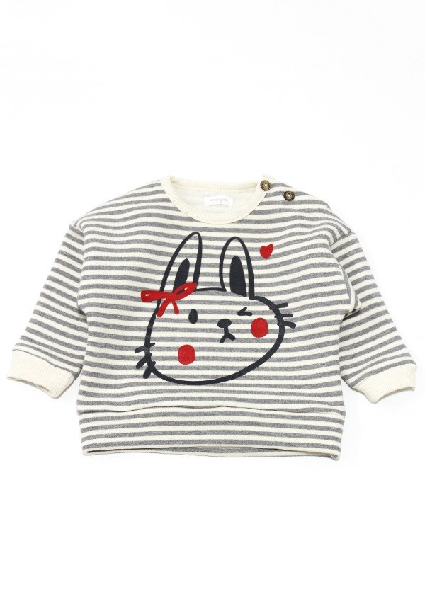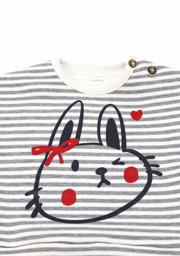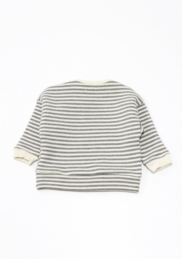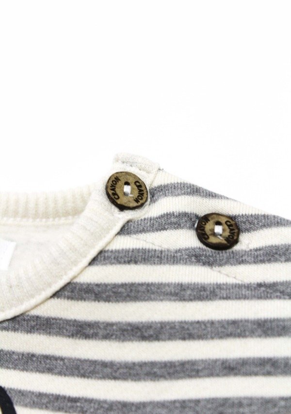 Buzo de frisa rayada gris/off white con puños y cuello en morley. Tiene estampa en el frente. Botones en el hombro para su apertura.