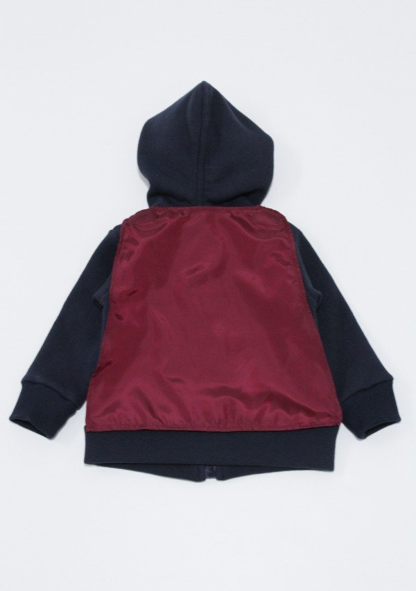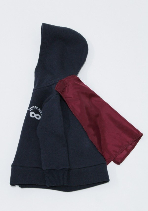 Campera de frisa invisible azul marino con cierre. Tiene estampa en el frente y capa de superhéroe en la espalda (tiene abrojo para sacar o poner).