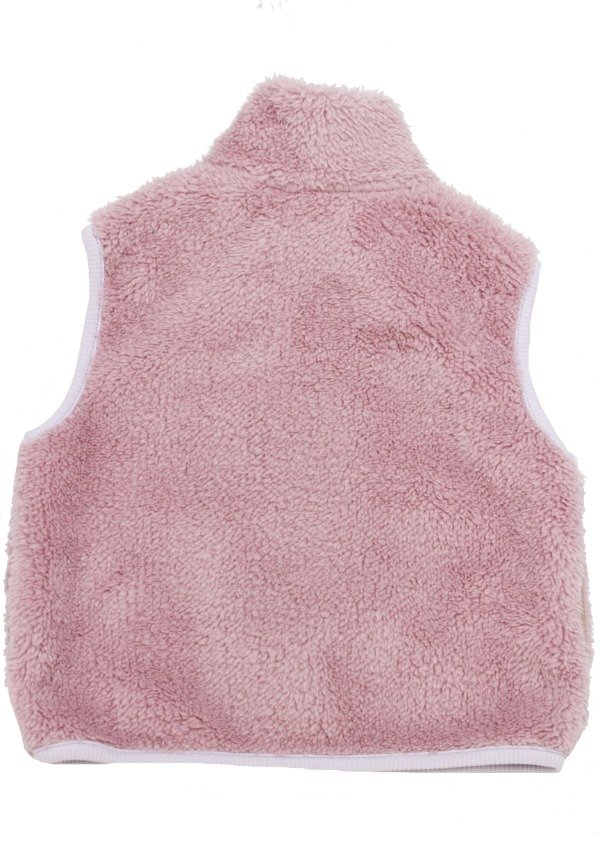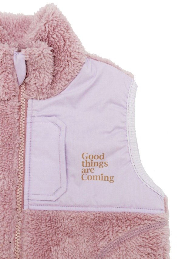 Chaleco de corderito rosa con el interior en waffle. Tiene cierre, bolsillos laterales y recorte en tela plana con estampa en el frente.