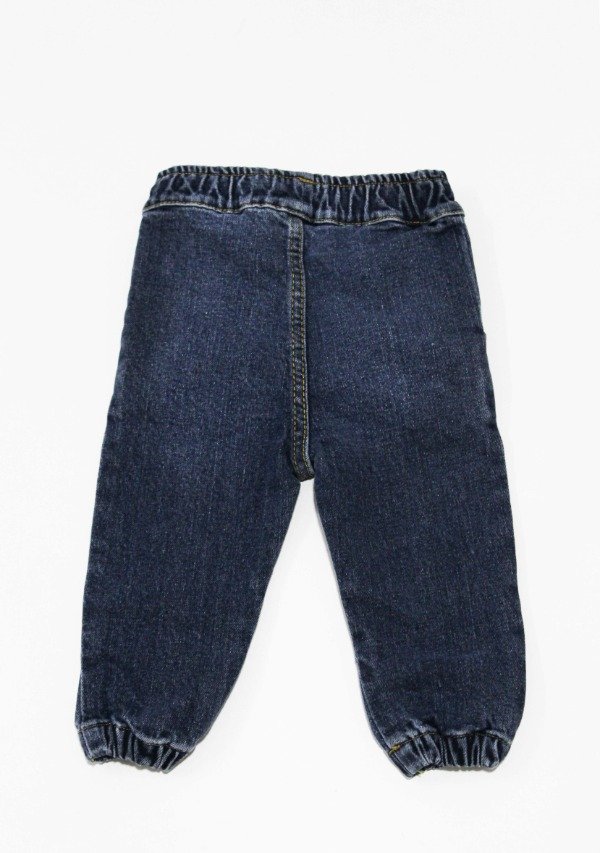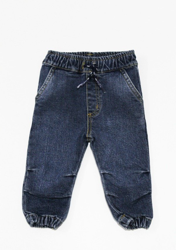 Jogger de jean con cintura y puños elastizados. Tiene cordón todo alrededor de la cintura para regular su calce.