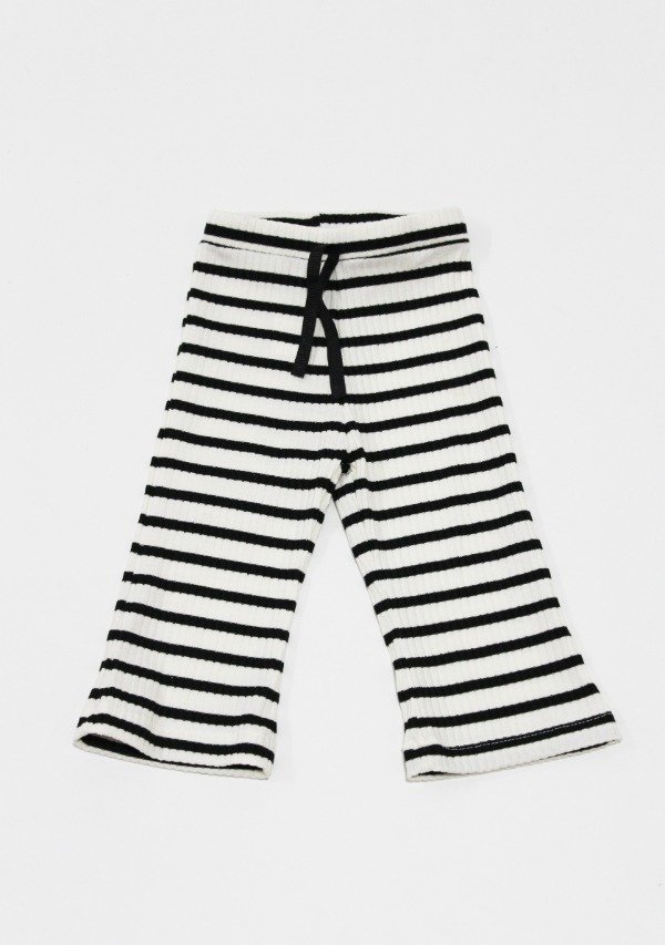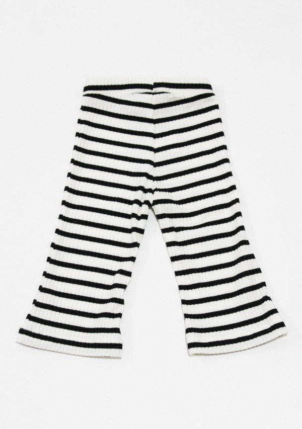 Legging flare de morley rayado blanca/negro con cintura elastizada. Detalle de bordador y cinta negra.