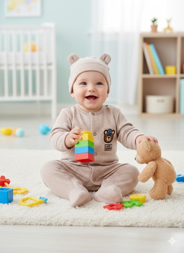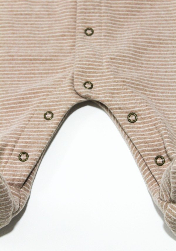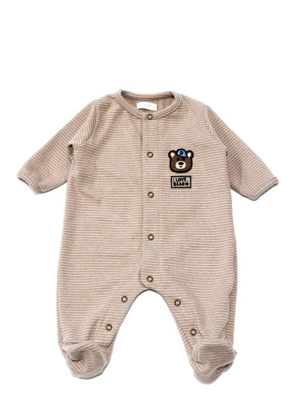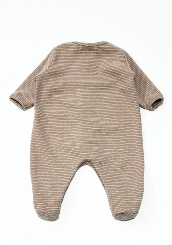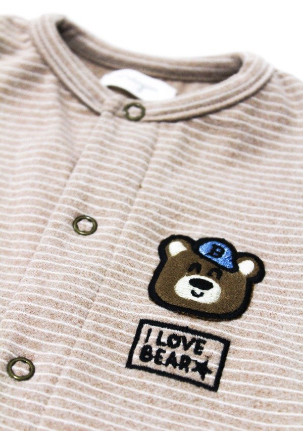 Enterito con gorrito en tela térmica rayada. Tiene broches y bordado en el frente.