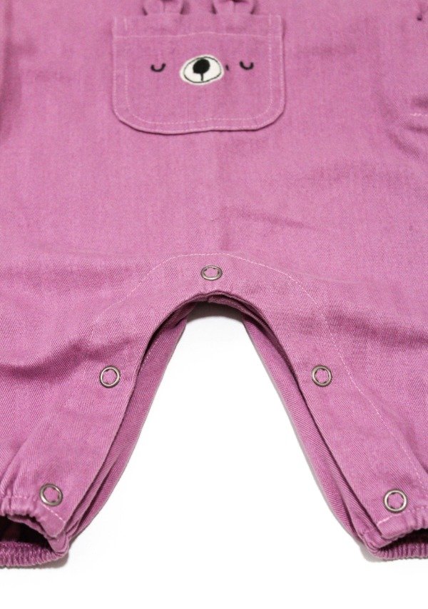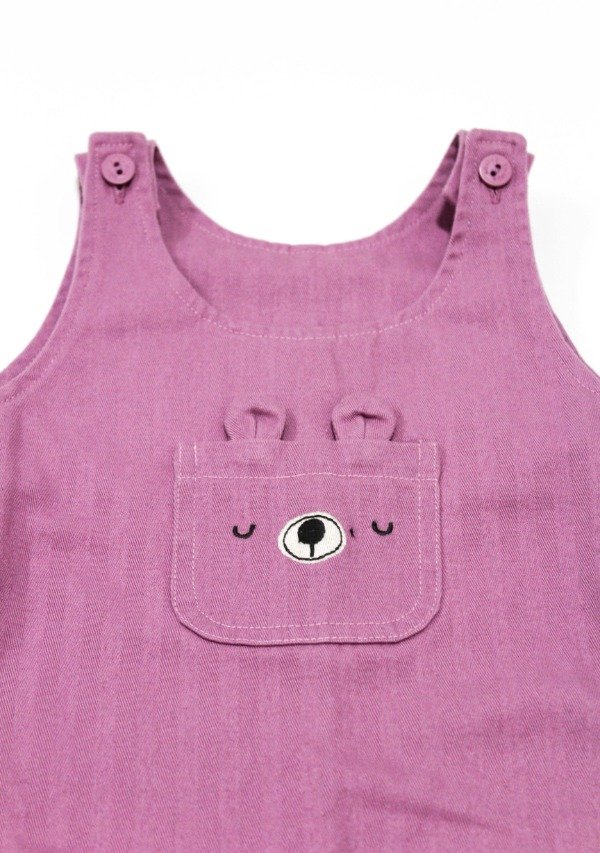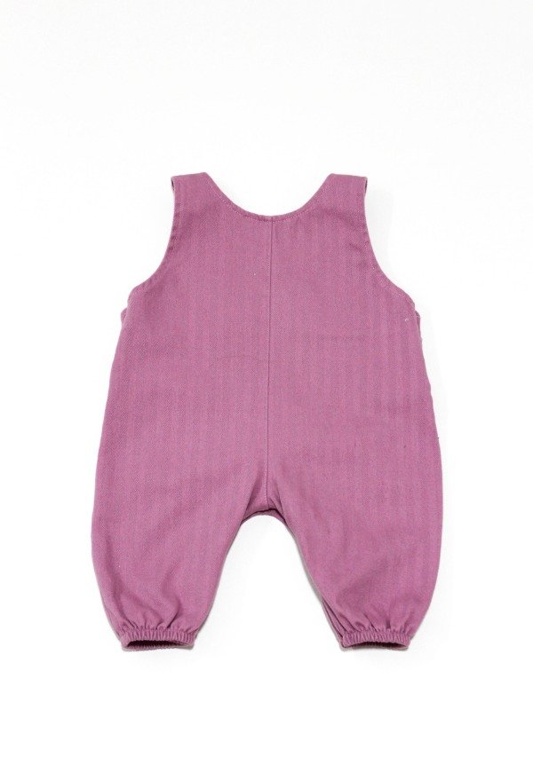 Jardinero en gabardina rosa tramado con bolsillo en el frente. Tiene cartera con botones laterales y broches en la entrepierna. Detalle de bordado.