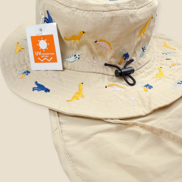 Está confeccionado en tela liviana, respirable e impermeable, con protección solar UV50, visera ancha y una solapa trasera que cubre la nuca, perfecta para días de playa, campo o paseo.