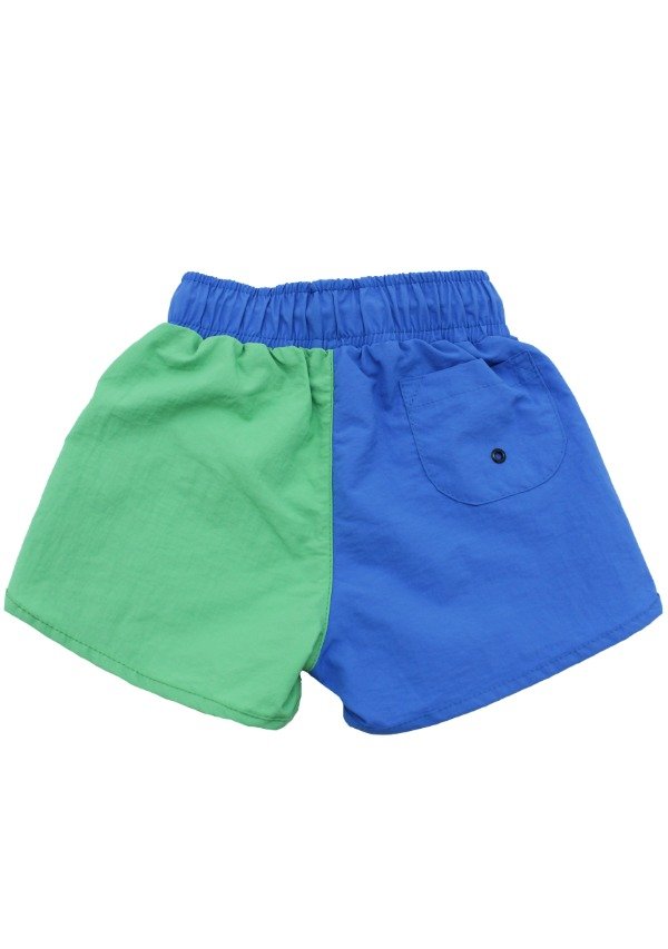 Short de baño bicolor verde y azul. Tiene cintura elastizada, bolsillo trasero y cordón todo alrededor para regular su calce. Estampa en el frente.