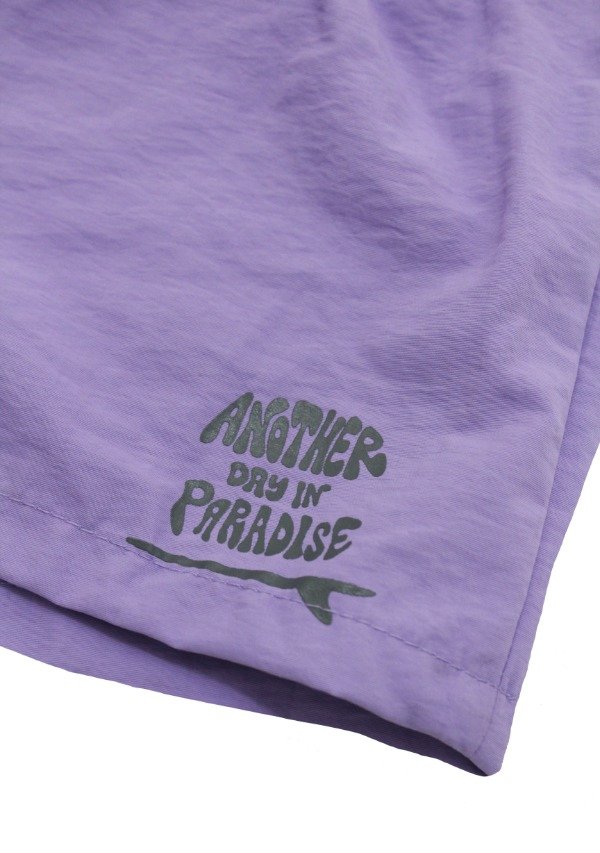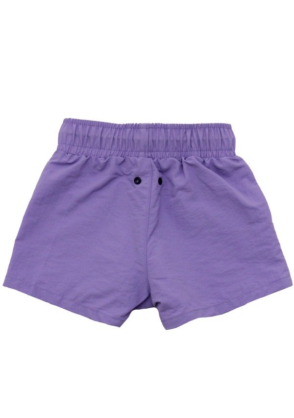 Short de baño de parachute lila. Tiene cintura elastizada, cordón todo alrededor para regular su calce y estampa en el frente.